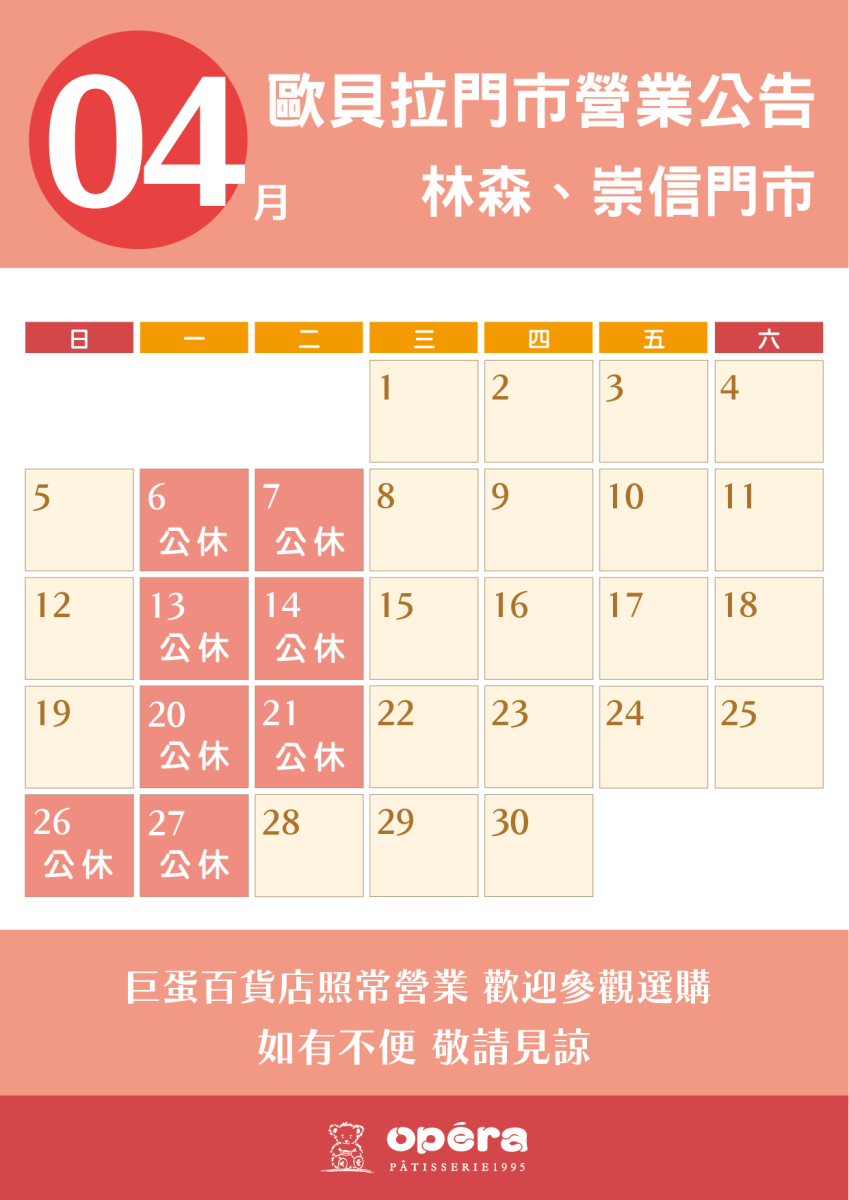 4月店休日期