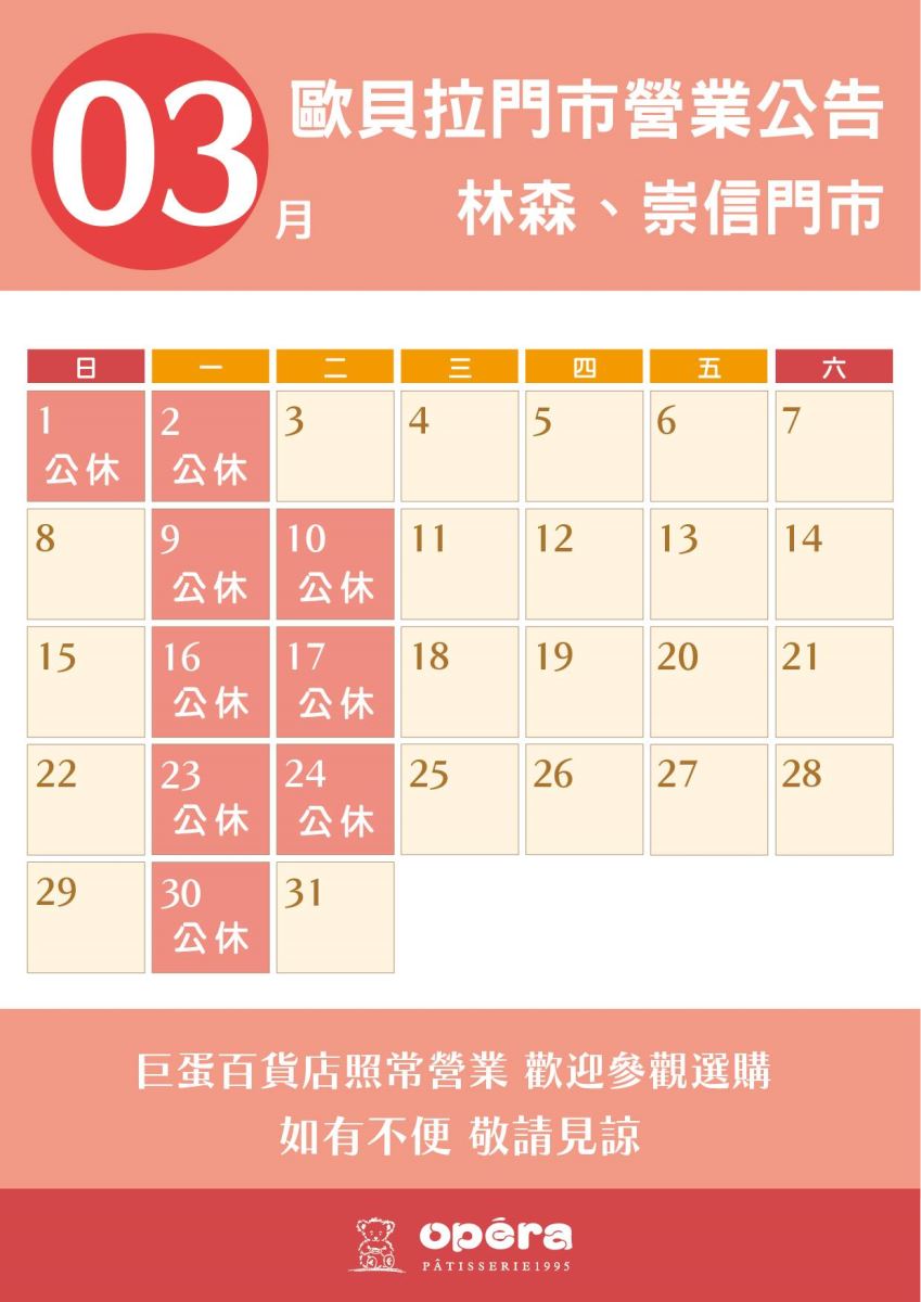 3月店休日期