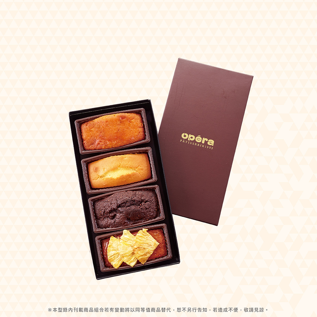 歐貝拉超人氣伴手禮,一次可品嚐到四種不同口味, 精選北海道進口乳酪使蛋糕濃郁香醇、口感甜而不膩 日本進口的檸檬絲,清新香氣與綿密口感 精選台灣在地小農直送新鮮無花果、鳳梨使用, 精緻用料與精美的外觀是節慶送禮首選。