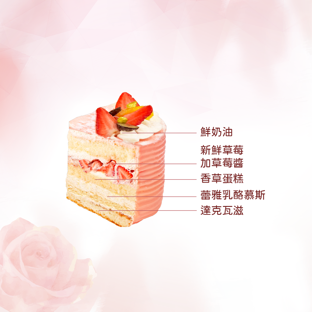 主要成分/ 鲜奶油、新鲜草莓、草莓醬、香草蛋糕、蕾雅乳酪慕斯(含吉利丁)