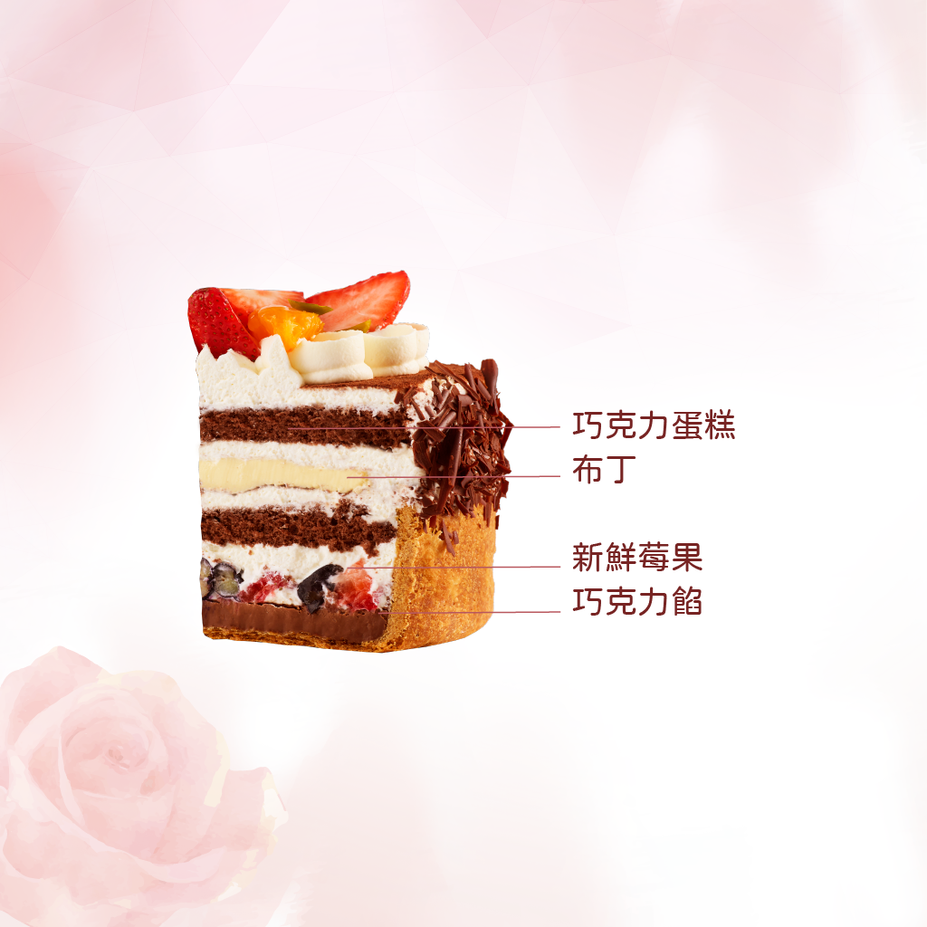 濃郁綿密的巧克力蛋糕,夾層柔滑布丁與新鮮莓果交織出豐富滋味。