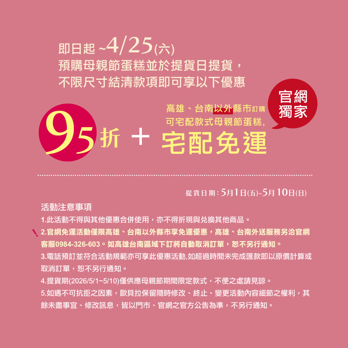※ 2026 歐貝拉母親節蛋糕提貨日:5/1(五)~5/10(日)